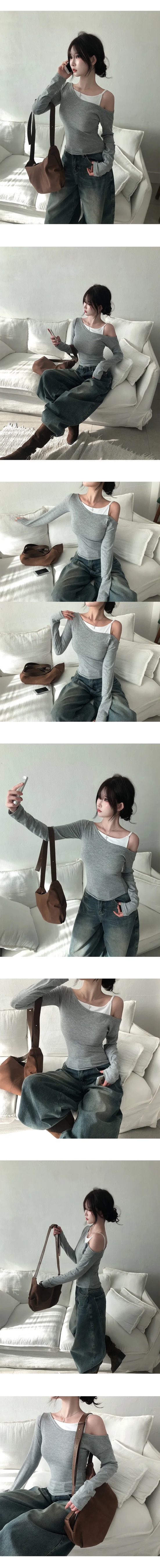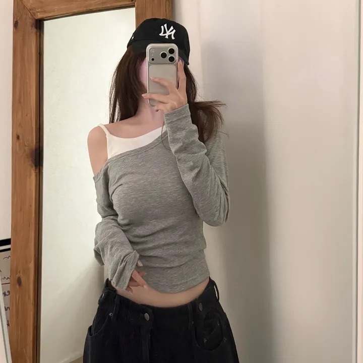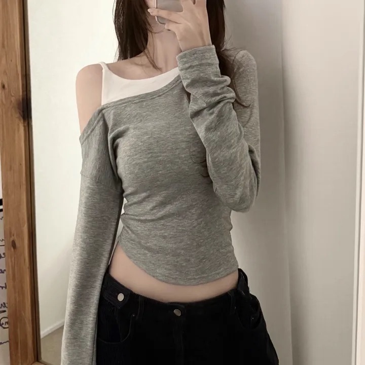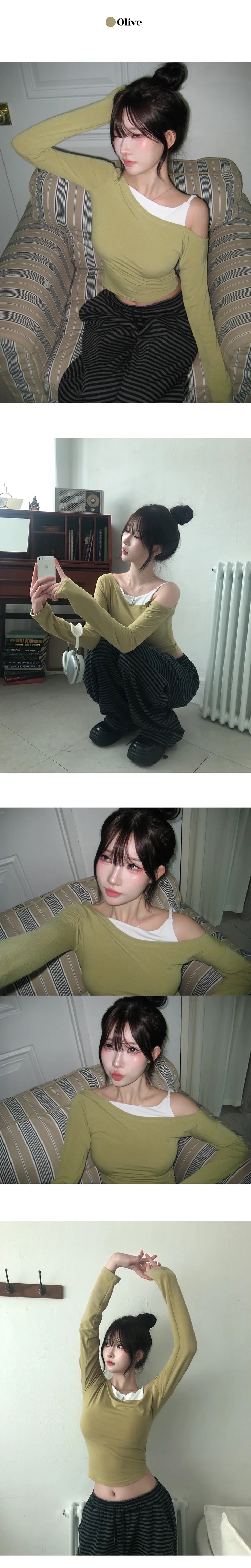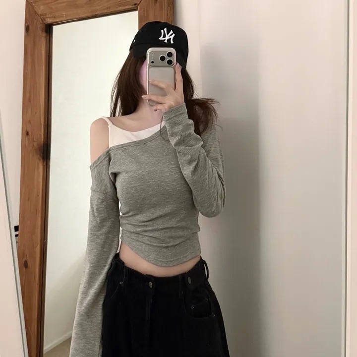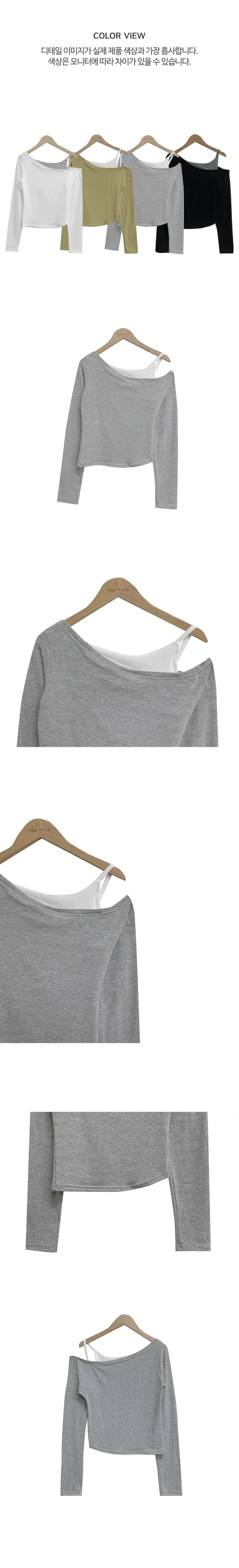 【優惠價預訂】韓國不對稱露肩假2件長袖上衣(4色)