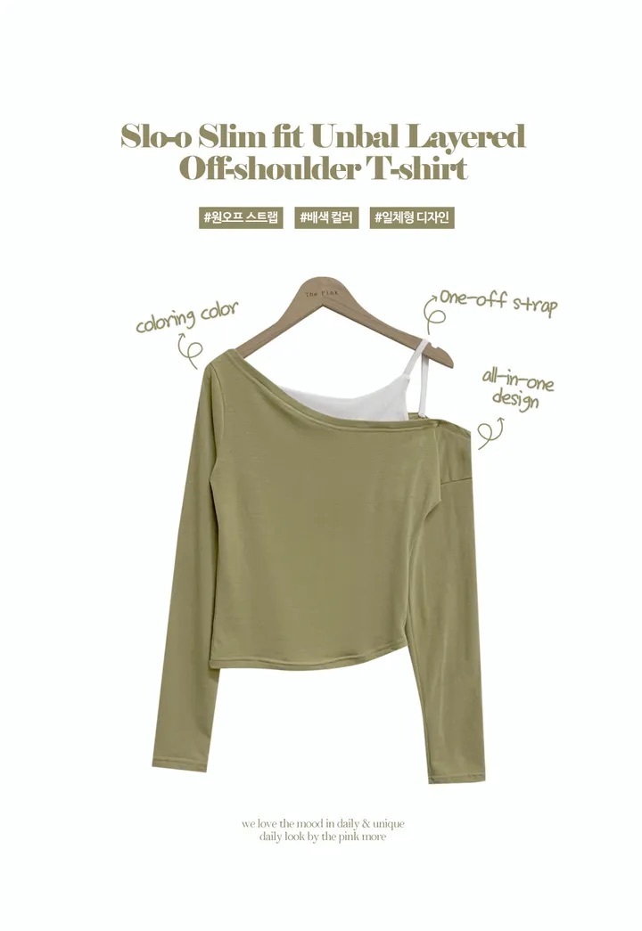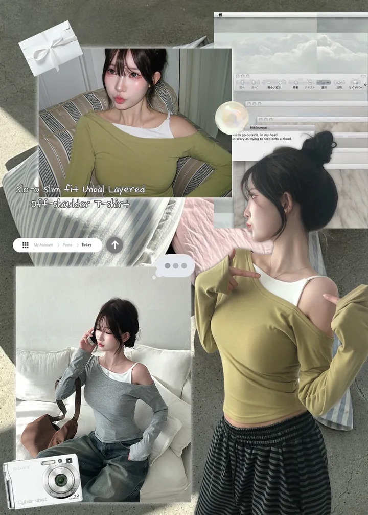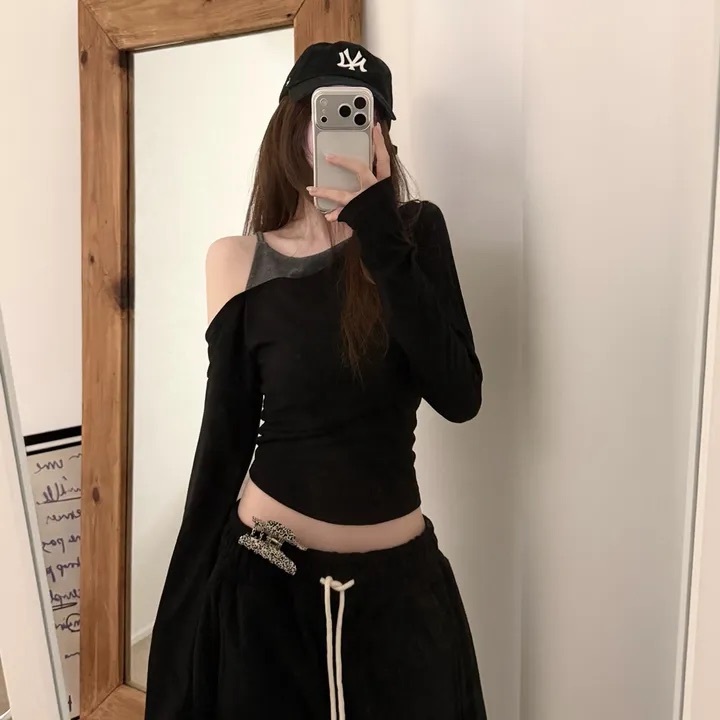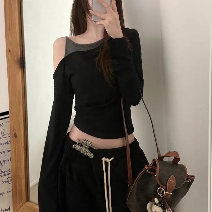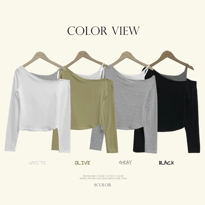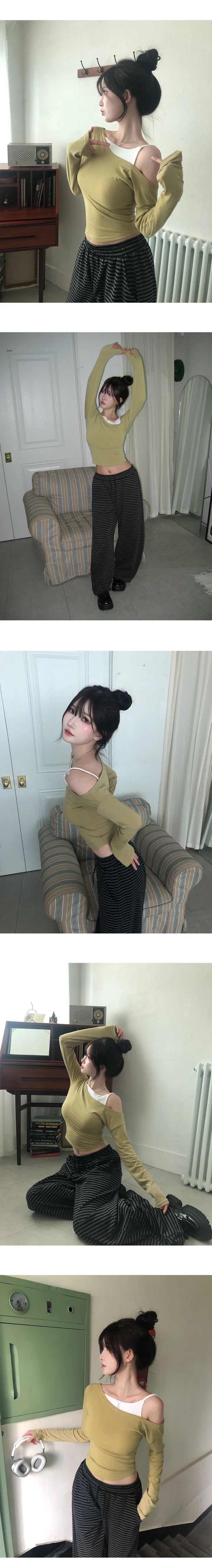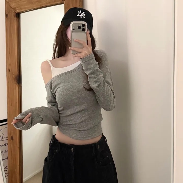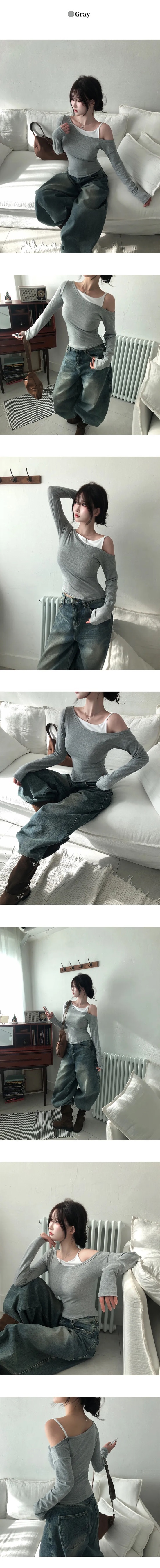 【優惠價預訂】韓國不對稱露肩假2件長袖上衣(4色)