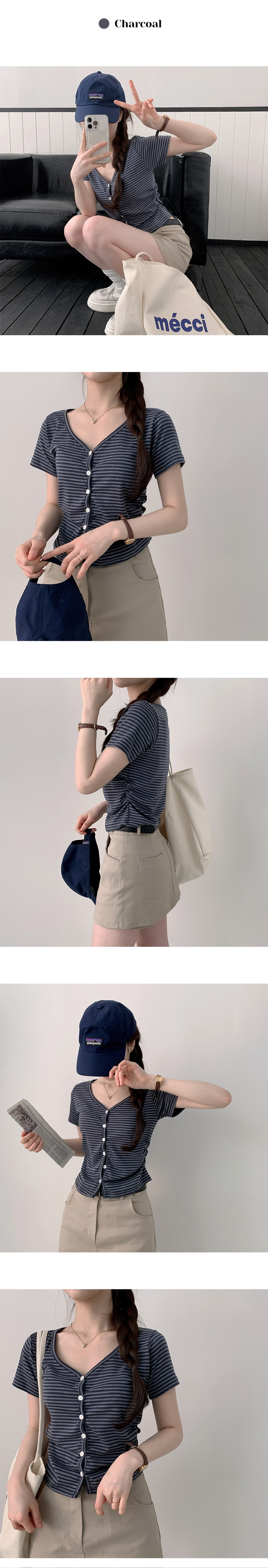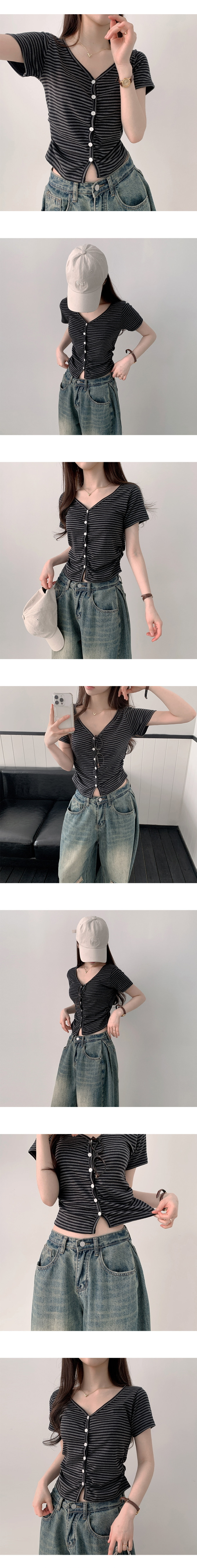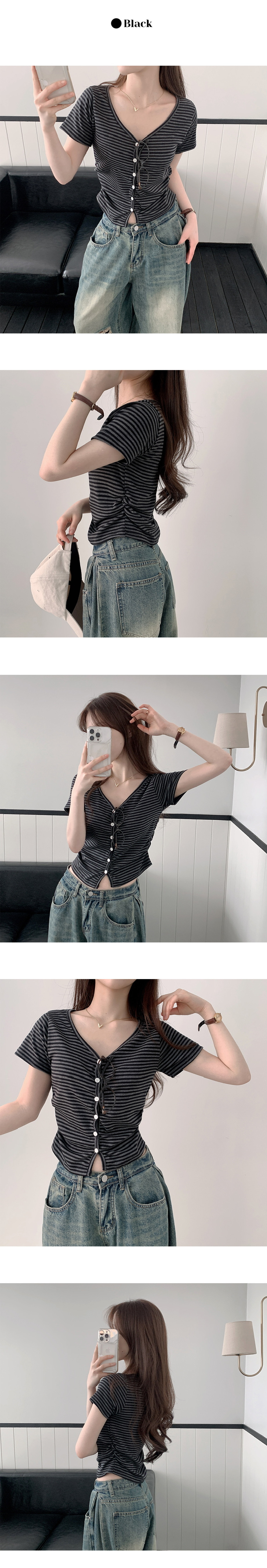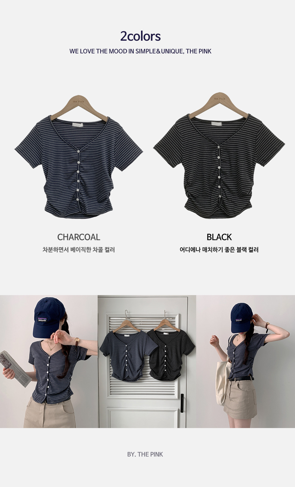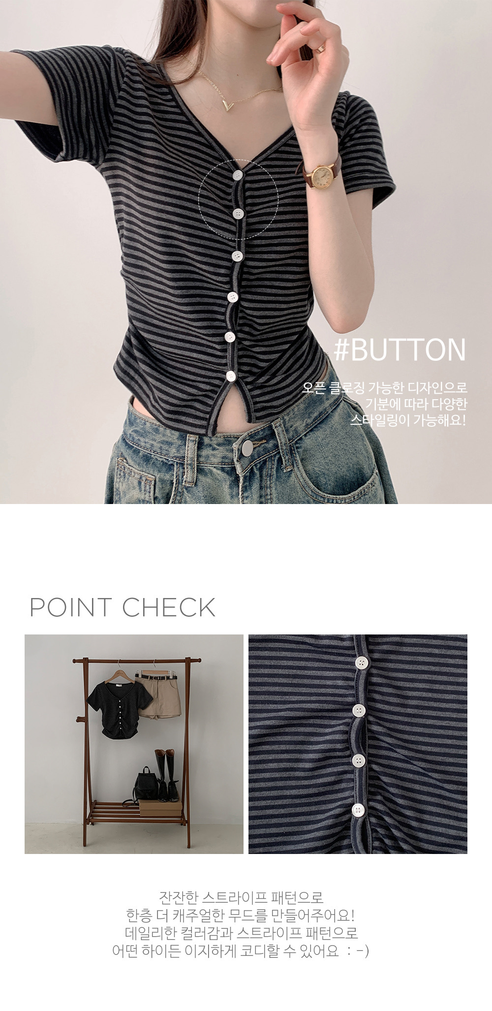 【優惠價預訂】韓國橫間V領鈕扣短袖TOP(2色)