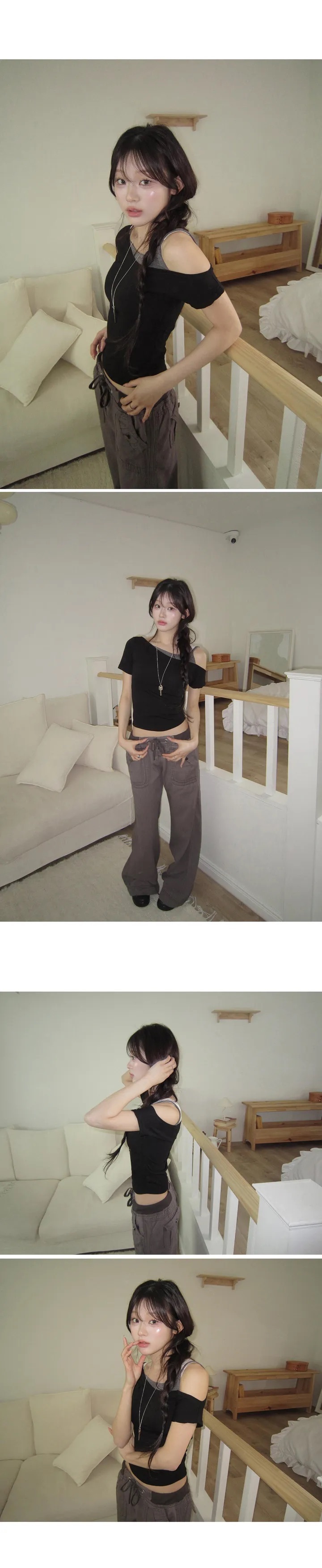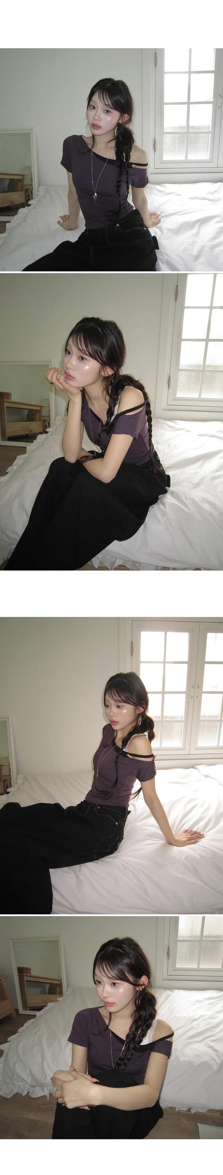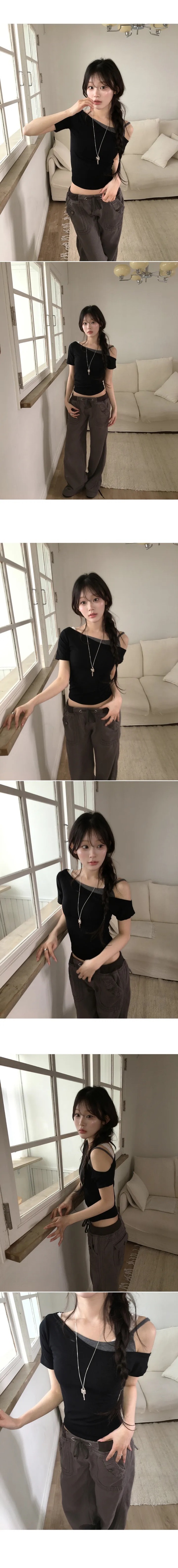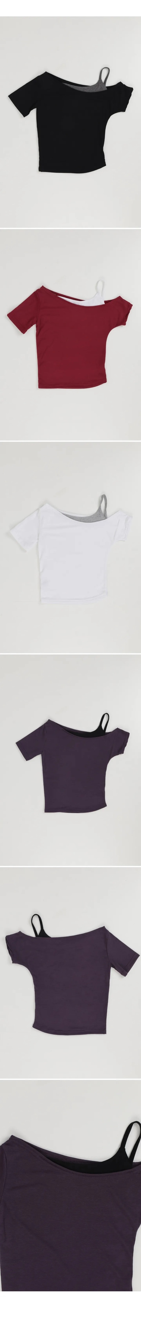 【8.4 完額外95折優惠預訂】韓國假2件斜膊撞色修身短袖上衣(4色)
