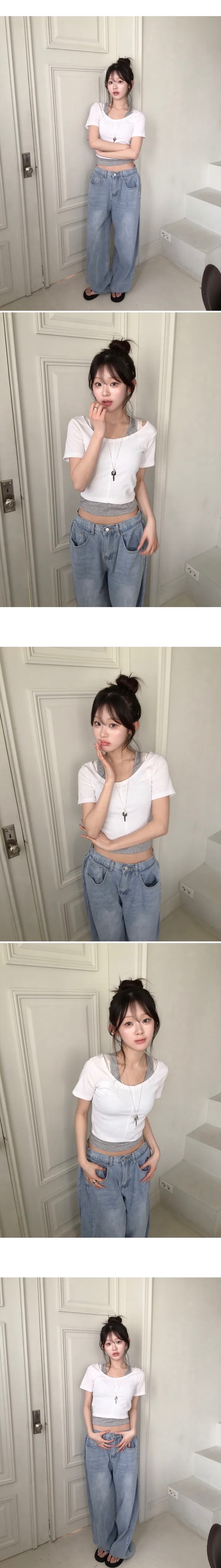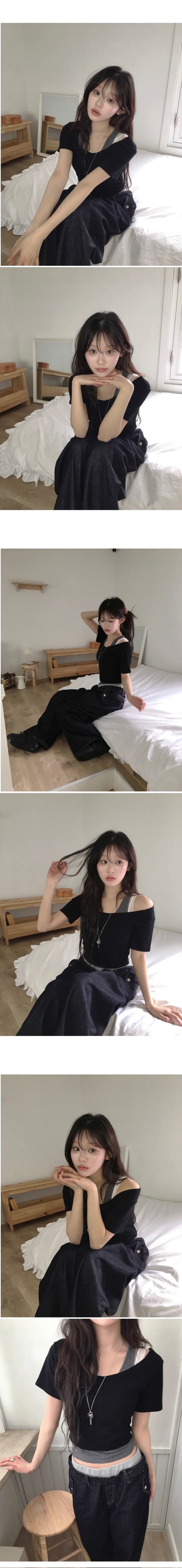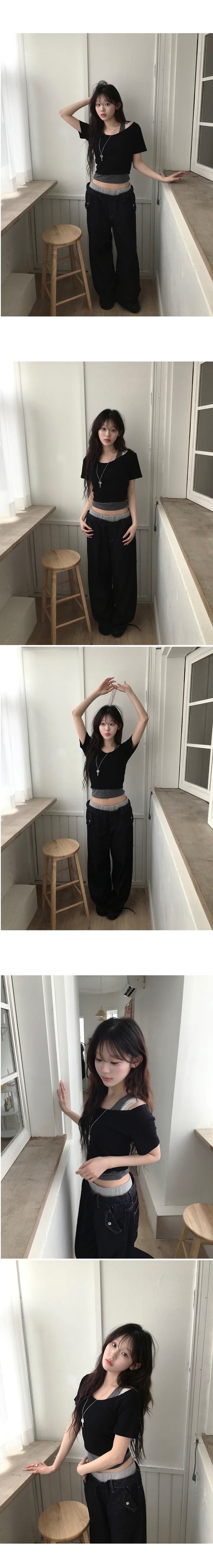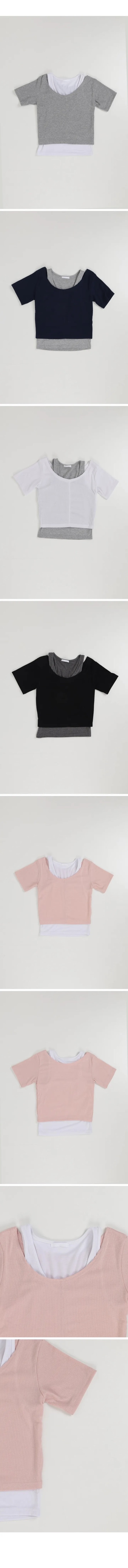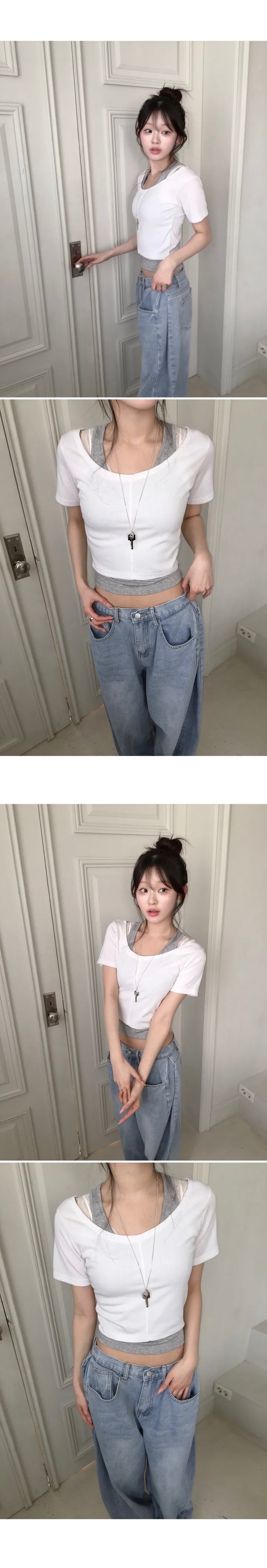 【8.4 完額外95折優惠預訂】韓國大U領假2件修身羅紋短袖上衣(5色)