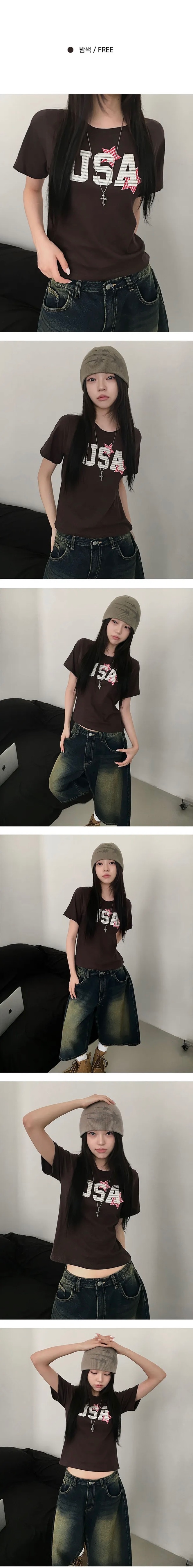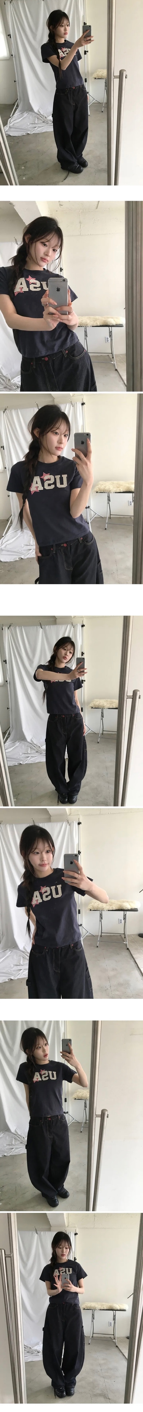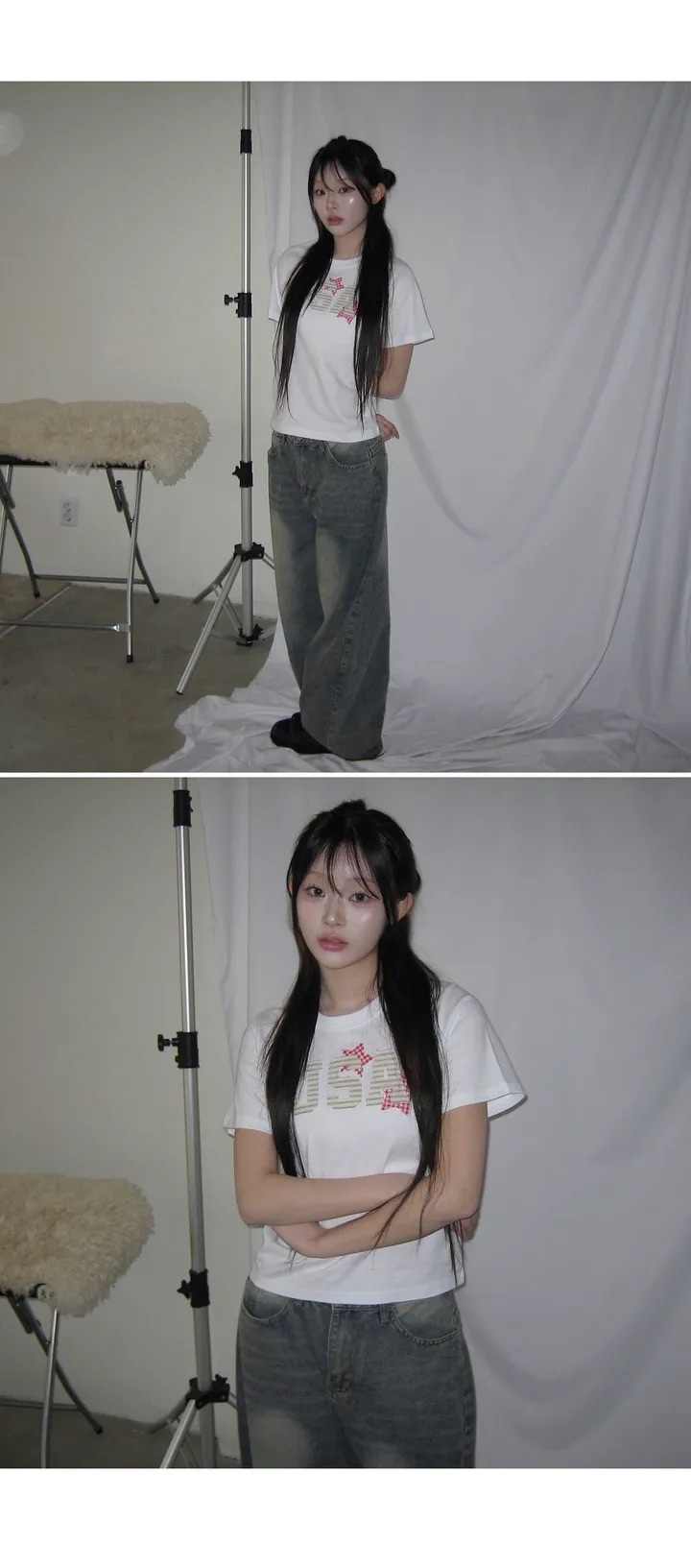【15.4 完額外95折優惠!首批優惠價預訂】韓國美式復古USA字母星星拼布TEE(3色)