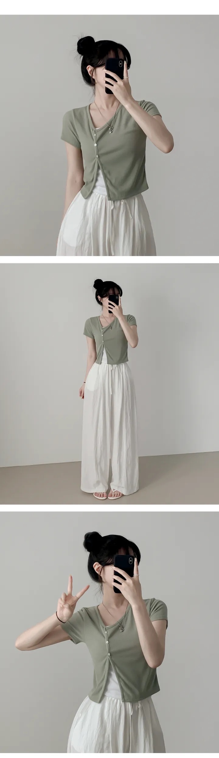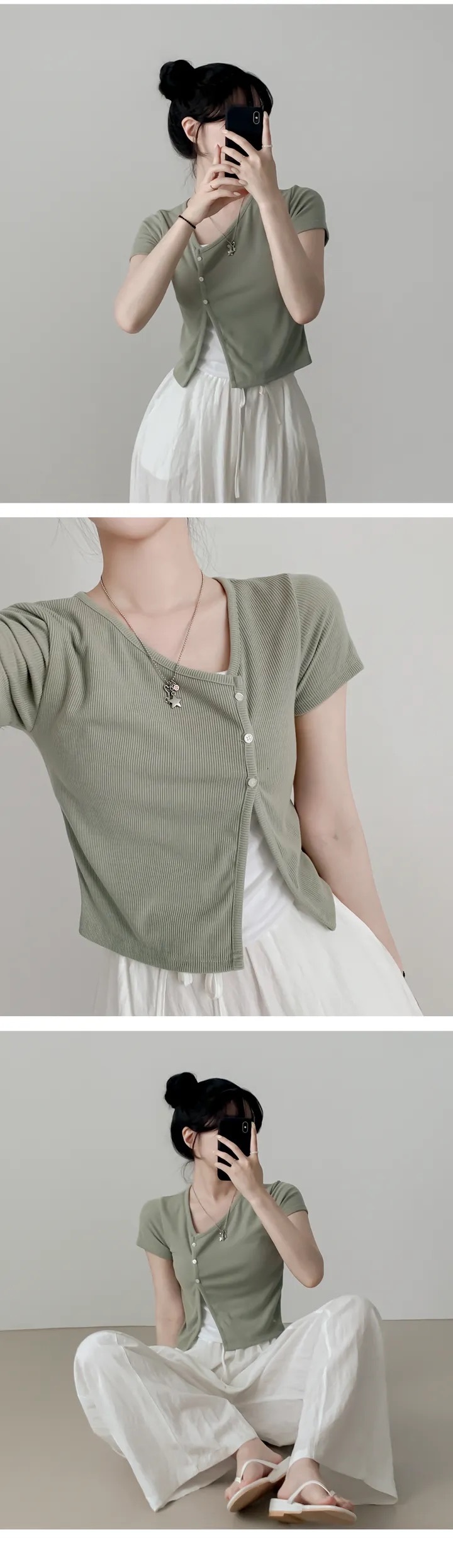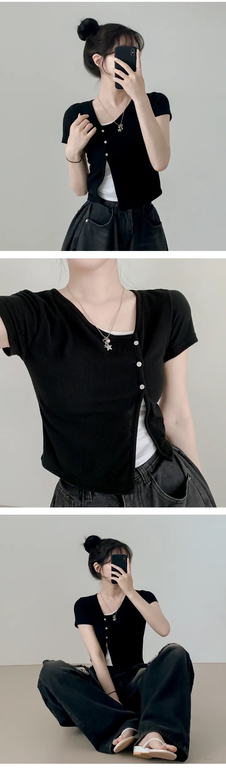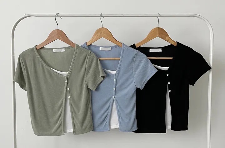 【優惠現貨】韓國斜領鈕扣拼色TOP(3色)