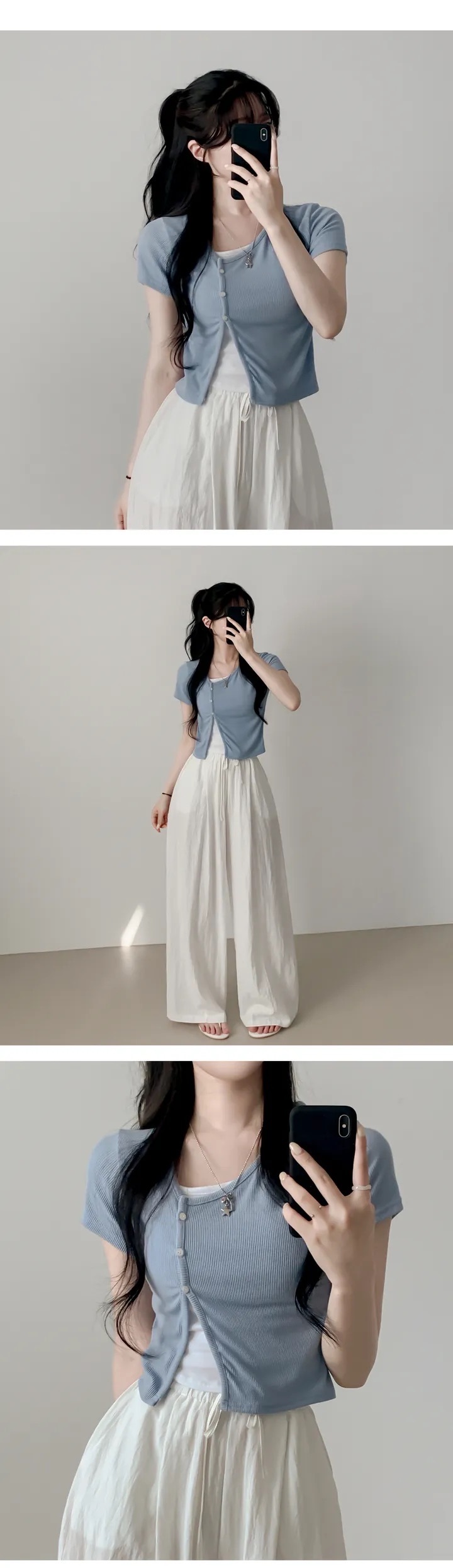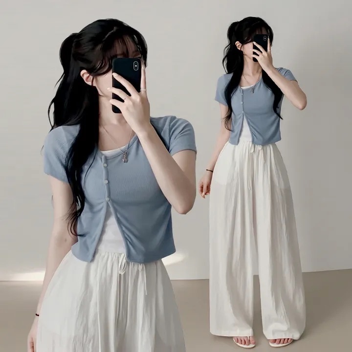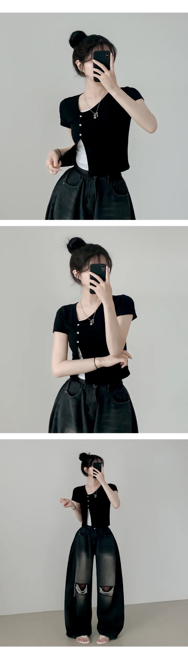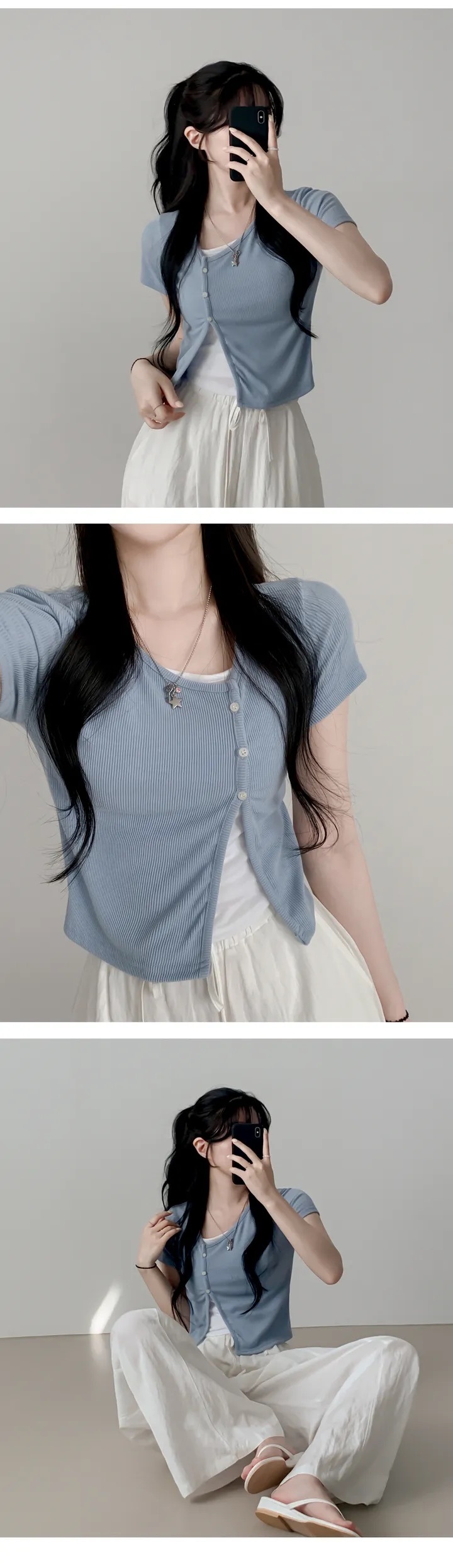 【優惠現貨】韓國斜領鈕扣拼色TOP(3色)