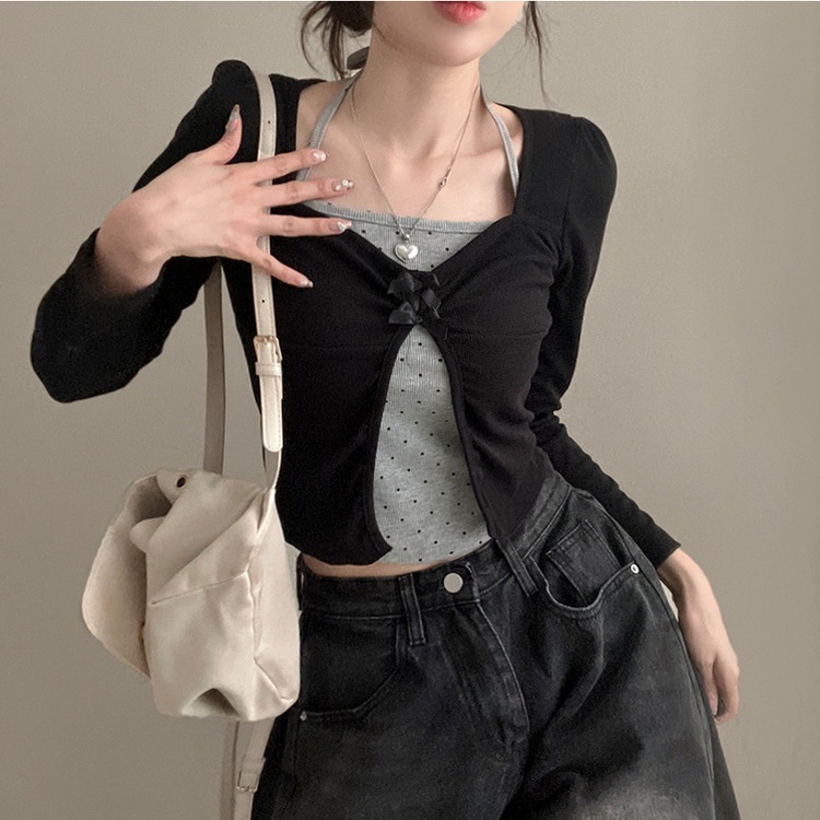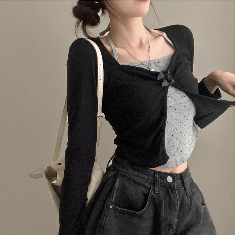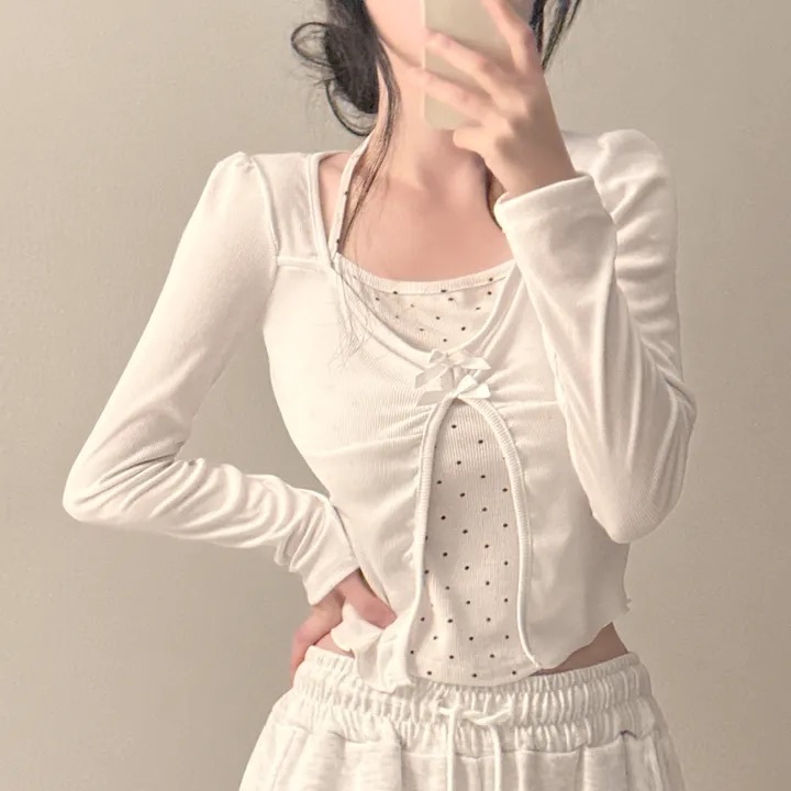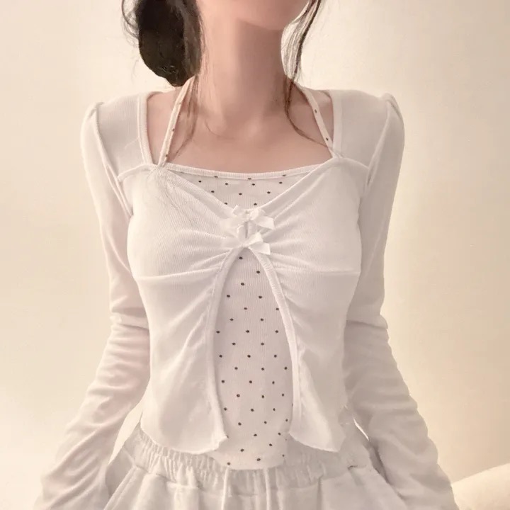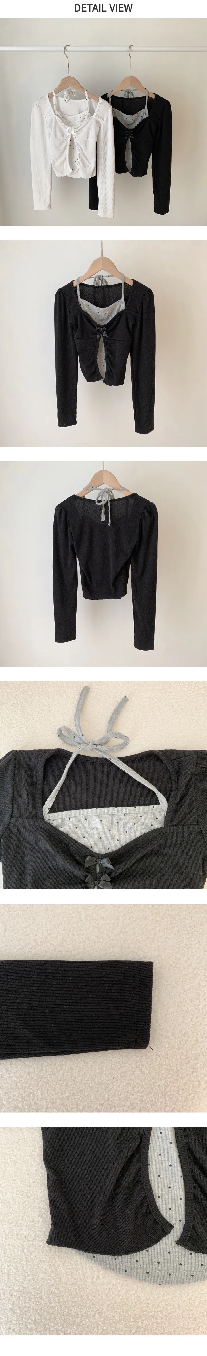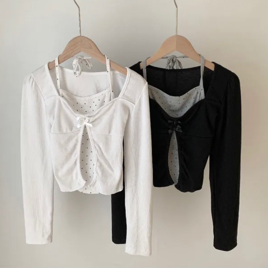 【優惠價現貨】韓國假2件波點掛頸蝴蝶結長袖上衣(2色)