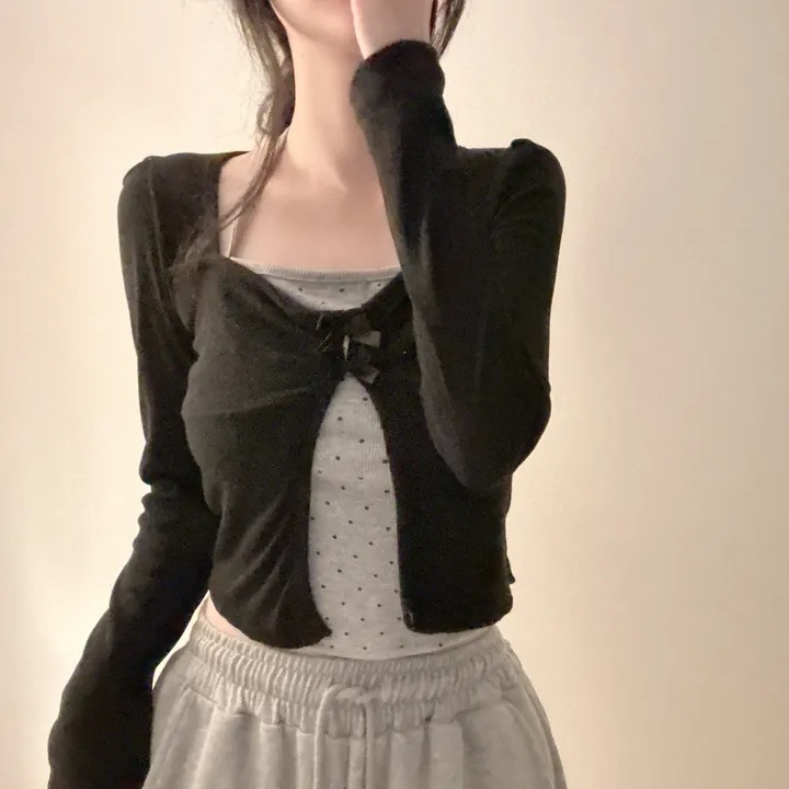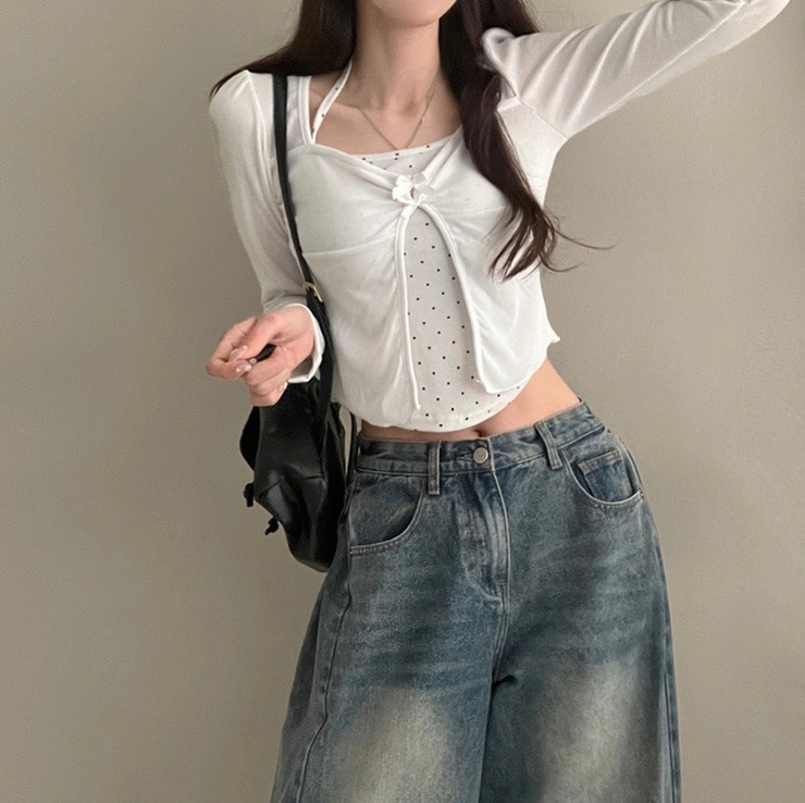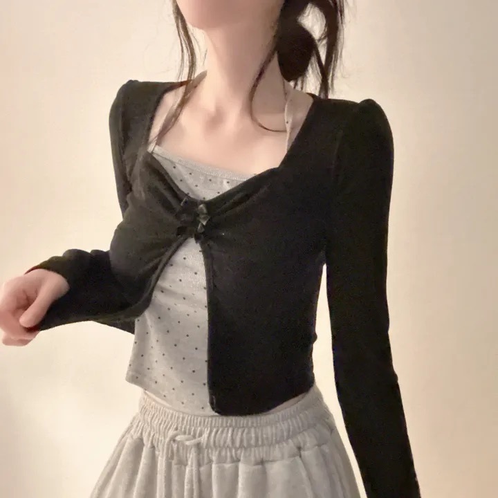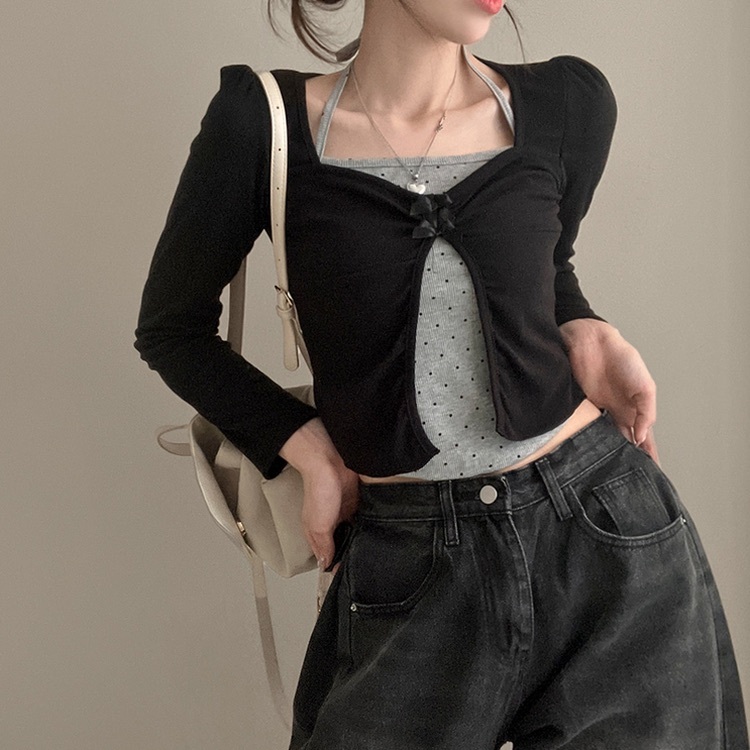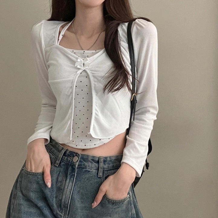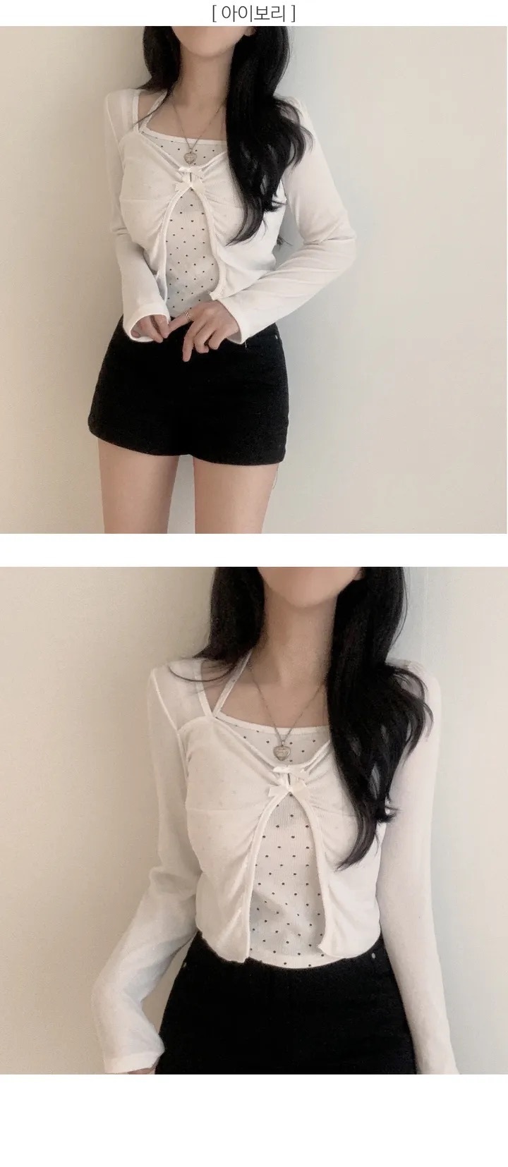 【優惠價現貨】韓國假2件波點掛頸蝴蝶結長袖上衣(2色)